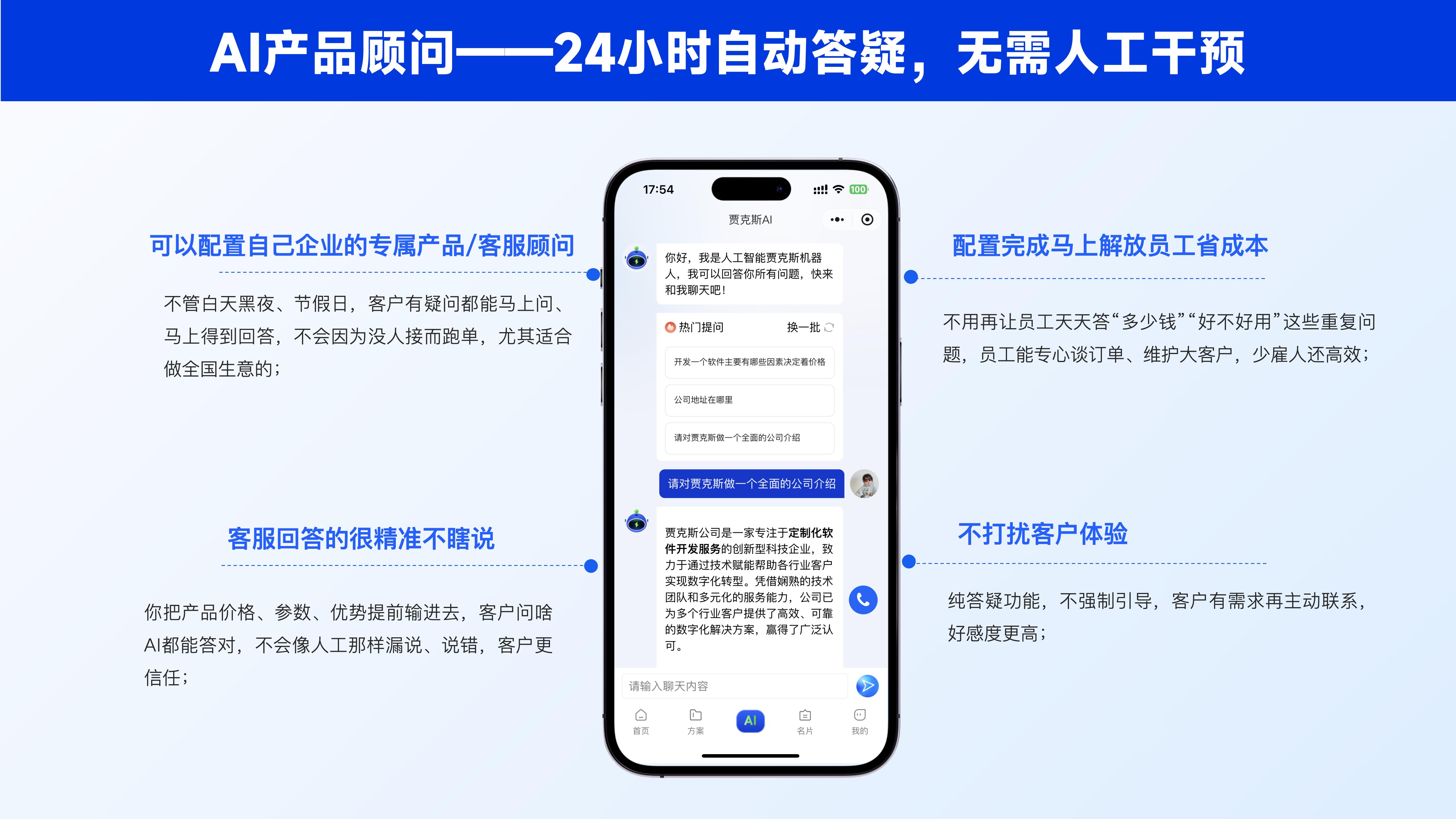 智能 AI 名片整合企业介绍、方案展示、AI 咨询全功能,让一张名片成为获客利器